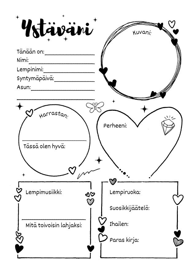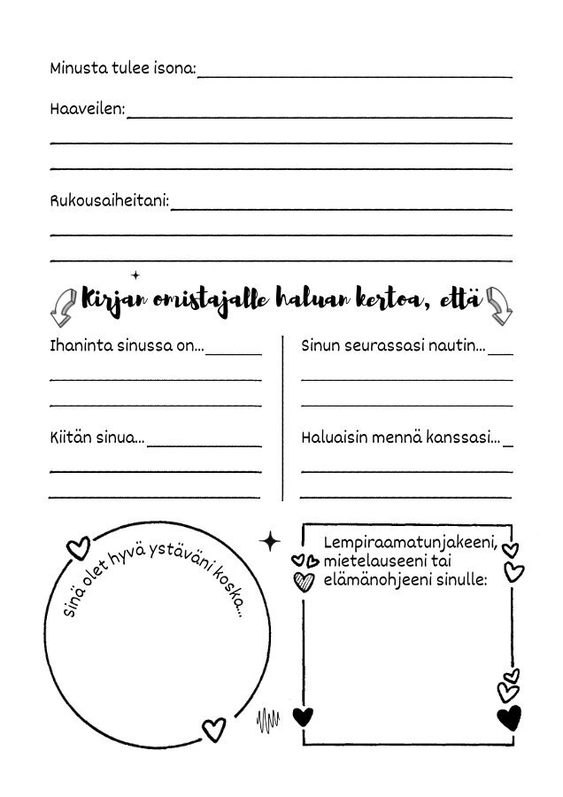 Tähän täytettävään ystäväkirjaan voit pyytää ystäviäsi kirjoittamaan asioita sinusta ja itsestään. Näin opit tuntemaan ystäviäsi entistä paremmin ja voit saada myös rohkaisua elämääsi ystävien kirjoituksista.